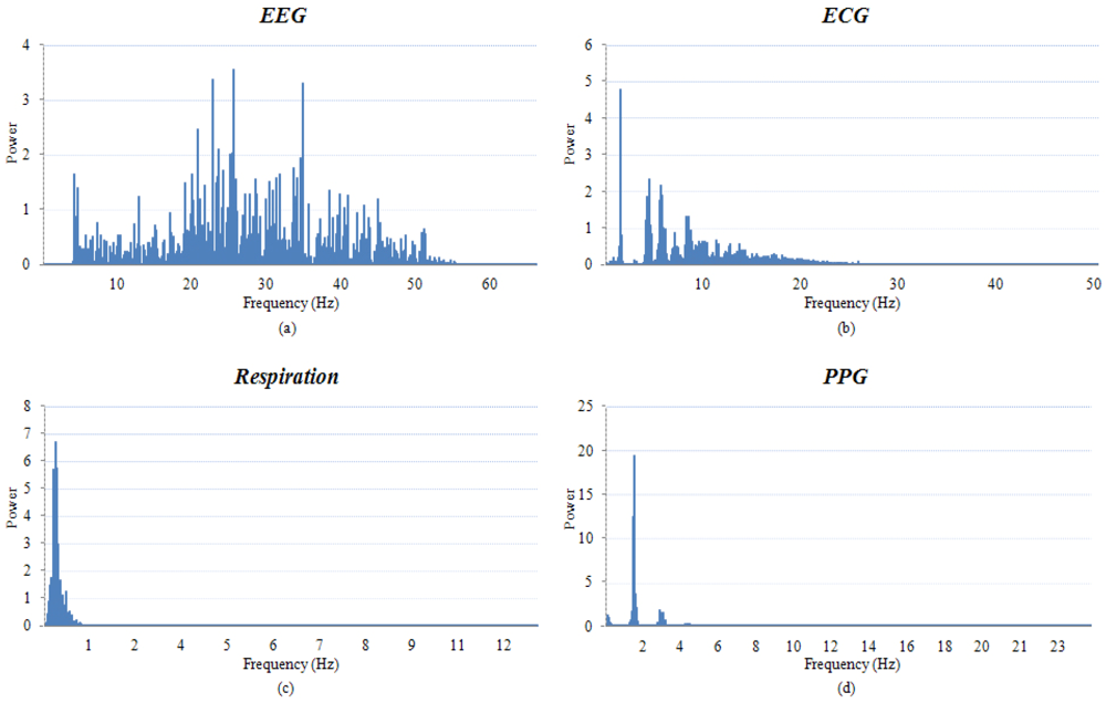 As illustrated in Figure 10(a), for EEG signals, frequencies between 4 Hz and 55 Hz were displayed, but signals below 4 Hz were filtered to avoid noise from the electrooculogram (EOG) signals. This represents the properties of the EEG signal very well. The frequency properties of the ECG signals in Figure 10(b) show that almost all the signals are located within 40 Hz. Although the LPF respiration range is below 12 Hz, most signals exist below 1 Hz, as verified by Figure 10(c). So, it seems desirable to narrow the LPF respiration range in future studies. The properties of the PPG signals shown in Figure 10 are typical of signals below 8 Hz.