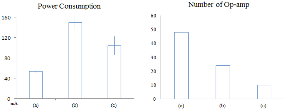 In Figure 11(a) the eight channel EEG platform needs 48 op-amps, (b) platform needs 24 op-amps and (c) the enhanced multi-body sensor platform needs just 10 op-amps. These methods reduce the cost of the system and have an effect on the size and weight of the system.
