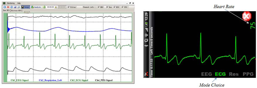 The left side of Figure 12 shows the waveform of the body signal measured by the integrated healthcare monitoring system. The right side of Figure 12 simply shows the ECG wave with a heart rate on the smartphone.
