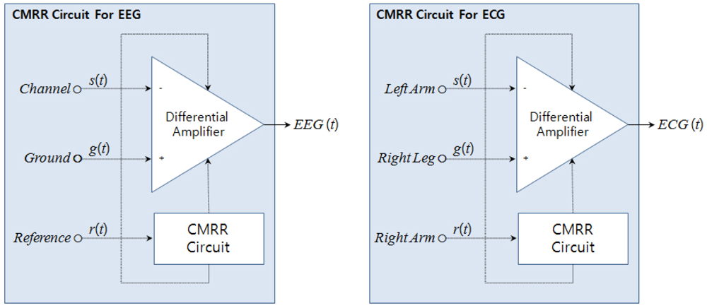 As seen in Figure 1, in order to avoid 60-Hz power-line noise in measuring EEGs and ECGs, high CMRR is needed. According to Figure 2, in the case of EEG, the channel signal is s(t) and the ground signal is g(t). Hence, the differential amplifier operates on the basis of the voltage difference of the two signals. At this point, EEG(t) uses a CMRR circuit with a reference signal (r(t)) to reduce noise. Therefore, three electrodes are required to measure EEG signals. In the case of ECG, the channel signal is s(t) from the left arm, the ground signal is g(t) from the right leg, and the reference signal is r(t) from the right arm.