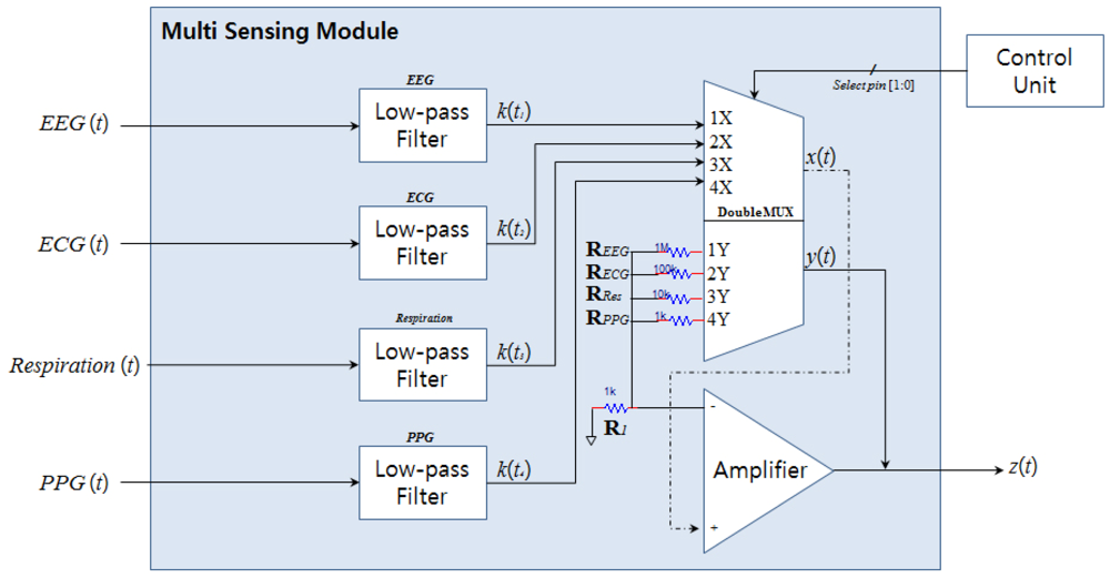 From a general point of view, the EEG (t) and ECG (t) are first amplified by the CMRR module, undergo filtering in the multi-sensing module, and then go through a second amplifier. As shown in Table 1, the LPFs vary in accordance with the properties of each signal.