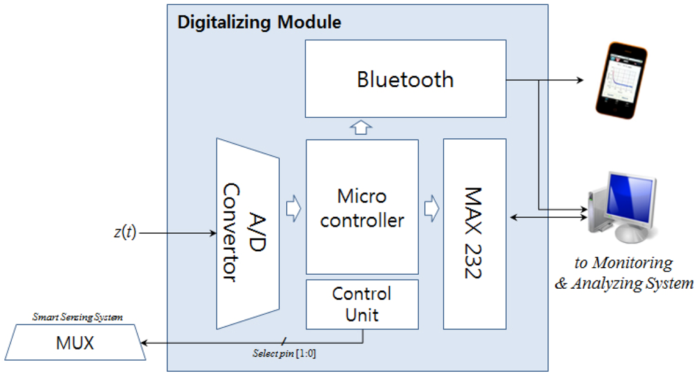 The main processor used for digitalizing is an ATmega128L (Atmel Corporation, San Jose, CA, USA). This microcontroller has a 128-KByte in-system programmable flash, a 4-KByte EEPROM for information storage, and a 4-KByte Internal SRAM [12]. It also includes a 10-bit analog-to-digital converter (ADC).
