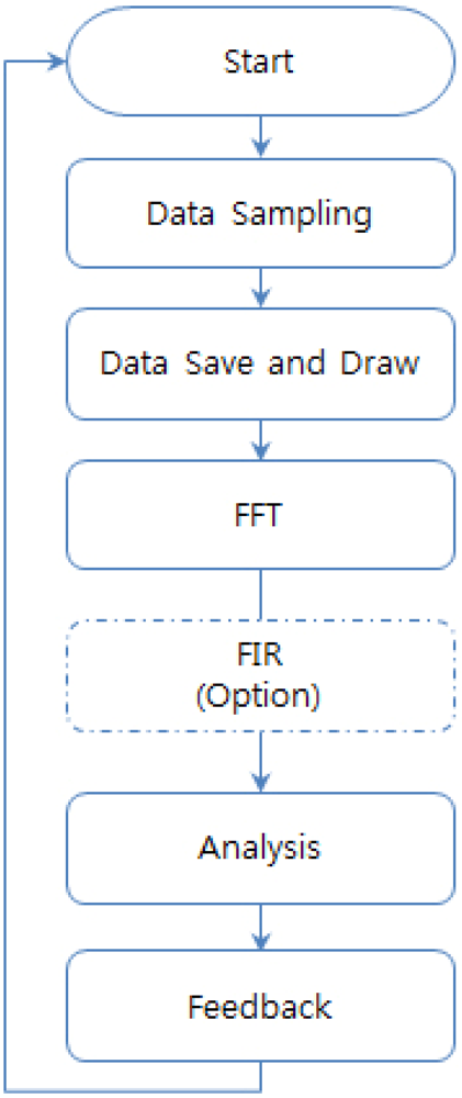 As seen in Figure 5, in the first step, the monitoring and analyzing module stores and draws signals that have undergone sampling. The next step consists of a Fast Fourier Transform (FFT) that converts signals in the time domain to equivalent signals in the frequency domain. The finite impulse response (FIR) removes the 60 Hz power-noise from the input signal. The final step in this module interprets and displays the obtained body signal information.