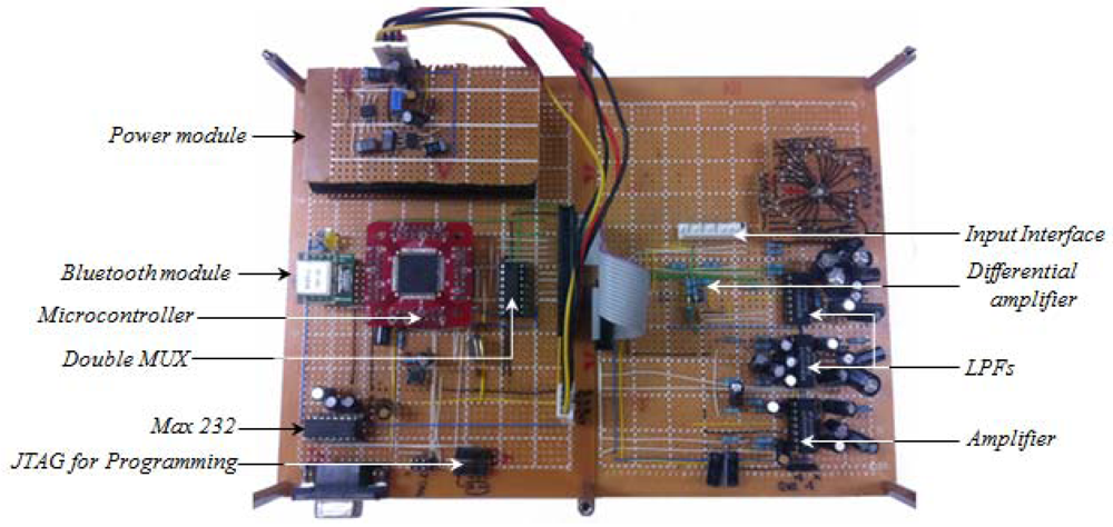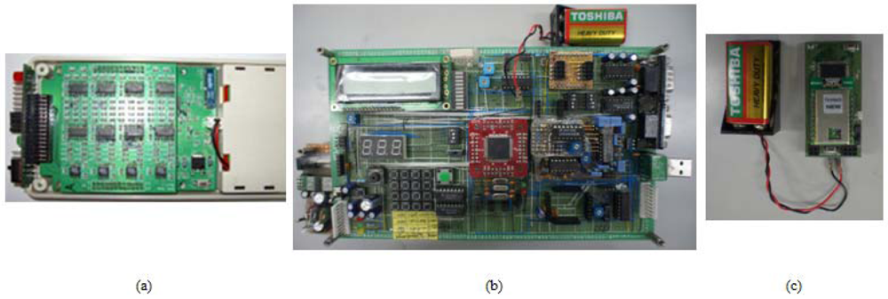 The Figure 8(a) depicts the eight channel portable EEG sensor platform based on the 8051 core using Zibee communication (IEEE 802.15.4) built in 2009. Figure 8(b) depicts a four channel multi body sensor platform for measurement of EEG, ECG, Respiration and PPG using Bluetooth communication (IEEE 802.15.1). Finally, The Figure 8(c) is the four channel multi body sensor platform implanted with an enhanced design for the analog circuit using Bluetooth communication. The power consumption of each sensor platform was measured using a 9 V commercial battery.