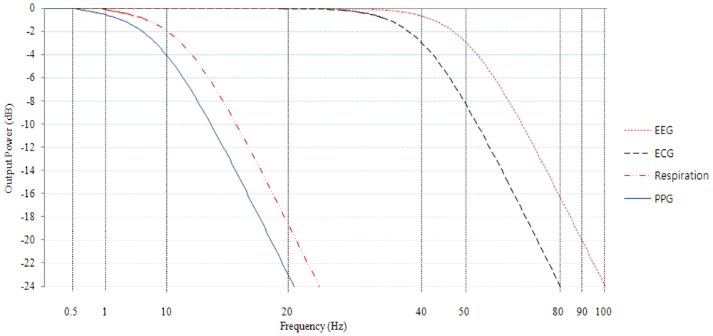 Figure 9 shows the amplitude frequency responses (AFRs) of the LPFs inside the multi sensing module presented in this research. This result is calculated using a function generator (AFG310, Tektronix, Inc., Beaverton, OR, USA). Input frequencies between 0.01 Hz and 100 Hz were used to output a sinusoidal signal of amplitude 1 V; the signals were measured with an oscilloscope (DSO7012B, Agilent Technologies, Inc., Santa Clara, CA, USA). The results shown in Figure 9 confirm that each body signal underwent filtering in accordance with the LPF frequency ranges listed in Table 1. It has also been verified that the frequencies were 50 Hz for EEG, 40 Hz for ECG, 12 Hz for respiration, and that PPG fell below −3 dB at 8 Hz [13,14].