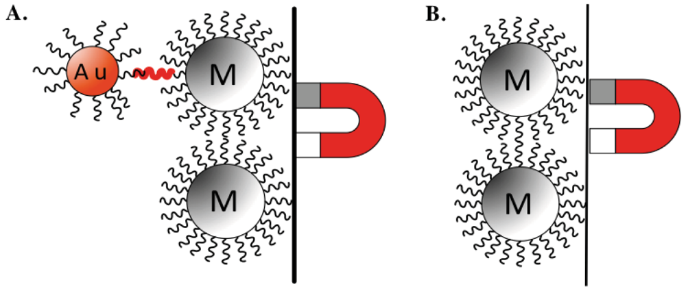 All oligonucleotides were synthesized by Integrated DNA Technologies Inc. (Coralville, IA, USA) as previously published [15]. In this study, PCR amplified complementary DNA targets were used for comparison or as negative controls. The creation of the PCR amplified DNAt positive control and the ssDNA probes for S. enteritidis were established by designing primers against the insertion element (Iel) gene of S. enteritidis, to ensure specificity to our S. enteritidis DNAt and decrease non-specific hybridization to non-S. enteritidis DNAt [27]. The following nucleotide sequences were used to create the ssDNA probes specific for S. enteritidis to be conjugated onto the magnetic and gold nanoparticles: ssDNA probe on Au-NPs: 5′-AATATGCTGCCTACTGCCCTACGCTT-SH-3′ (position: 919∼944), ssDNA probe on MNPs: 5′-SH-TTTATGTAGTCCTGTATCTTCGCCGT-3′ (position: 661∼686). From isolated S. enteritidis genomic DNA, we created a PCR amplified DNAt positive control using the following two primers: forward primer: 5′-CTAACAGGCGCATACGATCTGACA-3′ and reverse primer: 5′-TACGCATAGCGATCTCCTTCGTTG-3′. The creation of the PCR amplified non-specific DNAt (NS-DNA) used as negative control was made from isolated Bacillus anthracis (B. anthracis) genomic DNA, and used at a concentration of 0.1 ng/μL (100 ng/mL). B anthracis primers were designed against the pagA gene (accession number, M22589) using the following two primers: forward primer: 5′-AAAATGGAAGAFTGAGGGTG-3′ and reverse primer: 5′-CCGCCTTTCTACCAGATTTA-3′.