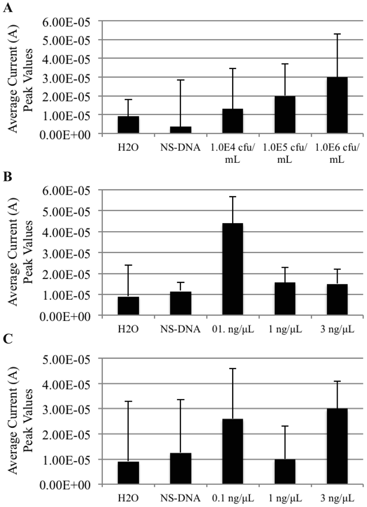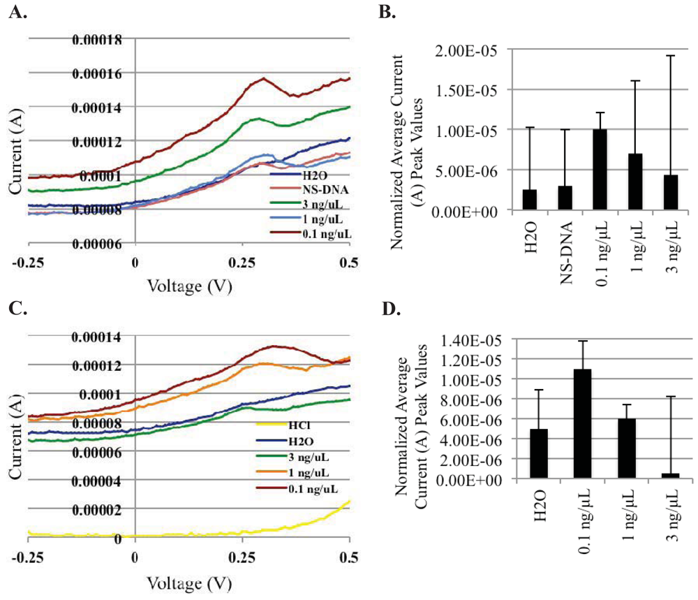 Functionalization of AuNPs and MNPs were executed as previously published [15]. Hybridization of DNAt samples was also executed as previously published [15]. In summary, extracted non-PCR amplified genomic DNAt (diluted to concentrations of 0.1 ng/μL, 1 ng/μL, and 3 ng/μL), PCR amplified DNAt, PCR amplified NS-DNA (negative control, 0.1 ng/μL) or H2O (blank), were denatured at 95 °C for 10 min with a thermocycler (Mastercycle personal, Eppendorf, Hamburg, Germany). Each denatured sample was mixed with functionalized MNPs and assay buffer and incubated at 45 °C for 1 h on a rotor shaker (model HS-101, Amerex Instruments, Inc., Lafayette, CA, USA). Following the incubation, MNP-DNAt complexes were washed and resuspended with assay buffer, and functionalized AuNPs were added. The mixtures were incubated at 45 °C for 2 h with constant rotation. Next, the hybridized sandwiched samples (AuNPs-DNAt-MNPs) were washed and resuspended with assay buffer, transferred to screen-printed carbon electrodes (SPCEs, Gwent Electronic Materials, Ltd., Pontypool, UK), and dried for 30 min at room temperature. Once dry, 1 M HCl was added directly to all SPCEs to dissolve the AuNPs and generate Au3+ ions. DPV was performed using a desktop potentiostat (Potentiostat/galvanostat model 263A, Princeton Applied Research, Oak Ridge, TN, USA) from 1.25 V to 0.0 V (with a step potential of 10 mV, modulation amplitude of 50 mV, and scan rate of 33.5 mV/s) to generate voltammograms produced by the reduced gold ions on the SPCE. A SPCE containing only HCl was used for establishing the baseline background noise. For each sample tested (control or experimental), two samples (duplicates) were made and assayed to garner an average DVP readout per sample.