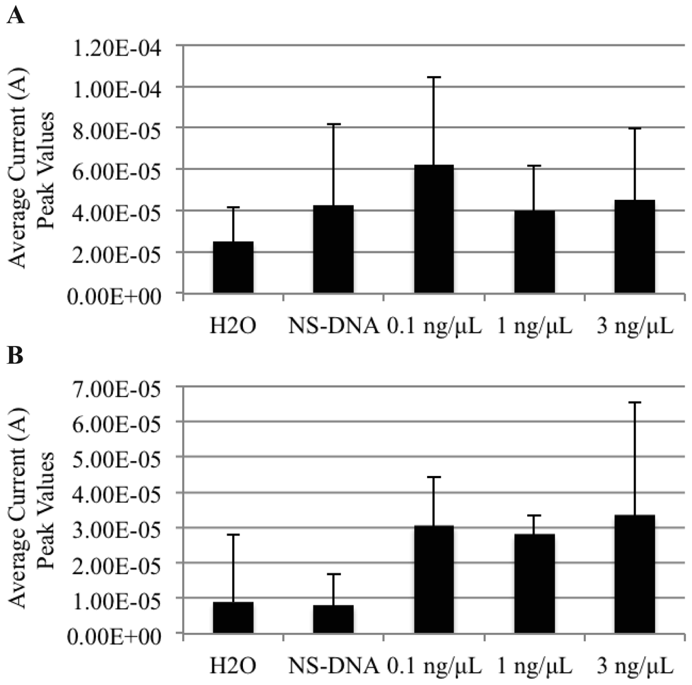 With the successful extraction of genomic S. enteritidis DNAt using both extraction methods, we next explored the ability of the AuNP-DNA biosensor system to detect the non-PCR amplified genomic DNAt products. For these experiments, extracted genomic DNAt samples were diluted to three concentrations (3 ng/μL, 1 ng/μL, and 0.1 ng/μL), denatured, and then mixed with functionalized magnetic MNPs and AuNPs (both contained immobilized/conjugated ssDNA probes specific for the Iel insertion element of S. enteritidis on their surface), and allowed to hybridize to create a sandwich structure due to their specificity (Figure 1). Following hybridization, sandwich structures were isolated and washed using magnetic separation, and then added to individual electrode SPCE chips for DPV readout. Current peaks were observed between 0.30 and 0.35 V, the reduction peak of gold ions. We found that similar to the detection of PCR amplified DNAt (Figure 2A), the AuNP-DNA biosensor was also able to detect non-PCR amplified PBC extracted DNAt (Figure 2B). Although there was some variability between duplicate samples, the results demonstrated a trend in average differential peak values of 5.0 × 10−7 A, 6.0 × 10−6 A, and 1.1 × 10−5 A, for the various S. enteritidis PBC genomic DNAt concentrations (3 ng/μL, 1 ng/μL, and 0.1 ng/μL, respectively). In addition, the specificity of our AuNP-DNA biosensor was also revealed as the detection peak of our negative control, PCR amplified B. anthracis non-specific DNA (NS-DNA: 3.0 × 10−6, 0.1 ng/μL) was found to be comparable to that of the H2O blank (2.5 × 10−6 A) (Figure 2A). Surprisingly, a hook effect was observed at the highest DNAt concentration tested, 3 ng/μL, in both the PCR amplified and non-PCR amplified DNAt detection, with detection peaks occurring at lower levels than those produced from the lower DNAt concentrations tested.
