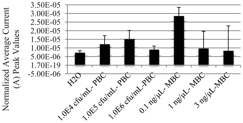 As the AuNP-DNA biosensor exhibited a trend towards the detection of non-PCR amplified genomic DNAt from PBC and MBC samples, we next determined if it could also detect non-PCR amplified genomic DNAt extracted from basic and acidic liquid food matrices spiked/contaminated with S. enteritidis PBC or MBC. We first spiked 9 mL samples of 2% milk (a basic food matrix, Figure 4A) and 100% orange juice (an acidic food matrix, Figure 5) with 1.0 mL of fresh, PBC of S. enteritidis at three bacterial concentrations: 1.04 cfu/mL (orange juice only), 1.05 cfu/mL and 1.06 cfu/mL. The spiked matrices were allowed to incubate at room temperature for 15 min before aliquoting a 1.0 mL sample of each for TRIzol® extraction of genomic DNAt. The DNAt samples were then hybridized with AuNPs and MNPs, and detected on the AuNP-DNA biosensor using DPV. The results display that the AuNP-DNA biosensor was also able to detect S. enteritidis genomic DNAt from PBC spiked basic and acidic food matrices at all levels of contamination (Figures 4A and 5).