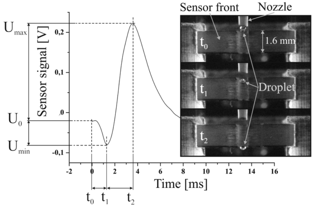 The simulation study presented in this paper is based on measurement results achieved with a capacitive sensor prototype which was applied to detect single droplets in flight [8]. The used sensor provides an open plate capacitor forming the measurement electrodes, which are fabricated in PCB technology. A droplet which passes through the capacitor generates a specific time dependent capacity change which is amplified to a voltage signal like shown in Figure 1. The negative dip at the beginning of the signal describes unexpected signal characteristics which could not be explained in first instance. Even stroboscopic image analyses did not clarify the origin of this specific characteristic (see provided image sequence in Figure 1). The presented simulation study was initiated to investigate the characteristics of the electrical field causing the said specific signal. Furthermore, information about the effect of certain parameters influencing the electric field is aimed by this study.