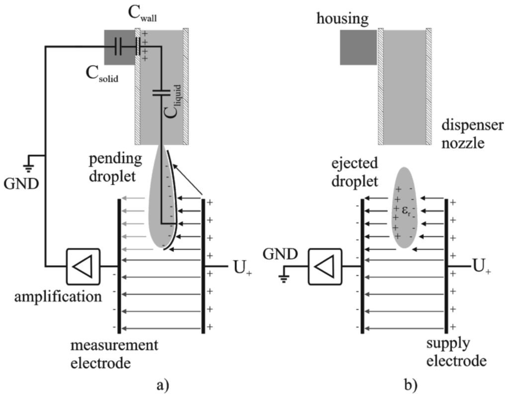 An increasing demand in the field of micro dispensing is the control of the delivered quantities of liquids. Especially non-contact dispensing applications in the pico- to the microliter range entail the need for novel measurement techniques to evaluate droplet volumes and the stability of the process in time. E.g., pharmaceutical research, based on quantification of several thousands of drug like substances or the imprint of quantitative readable lateral flow tests require precise information about the applied amount of liquids to improve the accuracy of the analysis [1–3]. Commonly, dispensing systems are calibrated by the manufacturer with test liquids e.g., water. This, however, does not guarantee the accuracy of each dispensed sample and implies trust in the ‘producers’ specifications and reported data. State of the art measurement techniques to determine droplet volumes in the nanoliter range are often not suitable for system integration due to their big mounting size or low accuracy, e.g., stroboscopic cameras [4]. Other approaches like gravimetric determination of the mass of a droplet require contact to the dispensed liquid which entails the loss of the measured liquid quantity. To address common shortcomings, non-contact measurement techniques have been reported. Based on the interaction of the dispensed liquid with an emitted light beam the droplet's presence as well as the dispensing process stability can be evaluated. However, these techniques do not allow for the measurement of a droplet's volume [5,6]. Alternative non-contact measurement methods are needed which enable the online determination of droplet properties like volume or velocity. Further requirements, like small size, easy system integration and a robust performance are also arising demands. A promising technique to address these challenges is to expose dispensed droplets to an electric field on their way from the orifice to the target. The change in the characteristics of the electric field measured by the change of the charge on a measurement electrode enables to evaluate properties like the droplet's volume and velocity [7,8]. This paper reports on a comprehensive simulation study of a free flying nanoliter droplet passing the electric field in between two charged electrodes with focus on the charge alternation induced by the droplet.