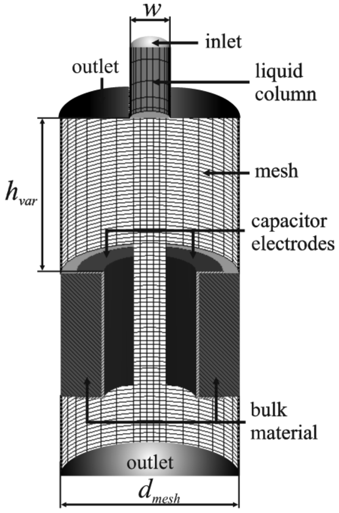 The numerical multi-physics model to study the electrical field of the droplet sensor is based on a structured 3D grid consisting of the droplet generator, implemented by a liquid column, and the capacitor electrodes embedded in the sensor support material (bulk material). The computational domain, shown in Figure 3, consists mainly of half shell shaped electrodes, like used for the experimental realisation of the sensor prototype [9] and some air space above and below the capacitor. The liquid column at the top side of the domain represents the liquid phase inside the nozzle of a droplet generator and enables to simulate a droplet dispensing process. The nozzle diameter (w) is 500 μm corresponding to the experimentally used PipeJet™ dispensing system [9]. The variable nozzle length (l) enables to study the capacitive coupling effect in detail and was initially set to 500 μm. The capacitor electrodes are centred underneath the nozzle at a variable distance hvar with an initial height of 2 mm. The geometry of the capacitor featured an inner diameter (d) of 1.2 mm and a trench width (s) of 400 μm, separating the electrodes. The electrodes' height (z) set to 1.6 mm reflecting the prototype's geometry. The electrodes are embedded in bulk material made of FR4 (εr = 4.8). In order to save computation time the mirror symmetry of the problem has been exploited and only half of the spatial geometry was modelled as shown in Figure 3.