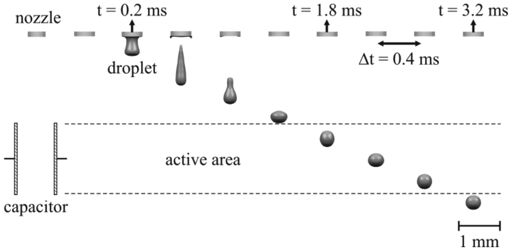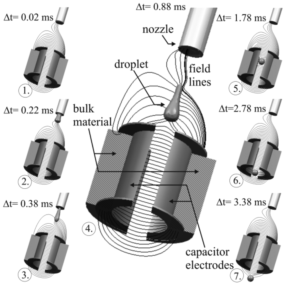 The numerical study of the presented capacitive measurement method requires the implementation of a droplet ejection process which generates droplets with realistic properties in terms of shape, volume and velocity. To keep the focus on the electrostatic interaction, a simple model of a droplet ejection process was realised, based on a liquid flow boundary condition driving the droplet ejection. Therefore, a liquid flow of a constant velocity (vflow) of 2.5 m/s was set as boundary condition at the top inlet of the cylindrical liquid column (cf. Section 3.1). The flow was active for 70 μs and then stopped instantly to initiate the droplet tear off. The applied parameters led to a droplet ejection process like shown in Figure 4, which reflects realistic and representative droplet properties in volume (V = 33 nL), shape and velocity (v = 1.4 m/s). The wetting conditions for the walls, surrounding the nozzle were set to a wetting angle (αwater) of 68° for pure water on the nozzle material. Furthermore, an outlet is defined at the lower end of the model to enable a balance of occurring pressure in the domain, caused by the droplet ejection. The wetting conditions at the electrodes are set to a ‘no wetting’ boundary condition (αwater = 180°), to avoid falsification of the results due to wet contamination of the electrodes.