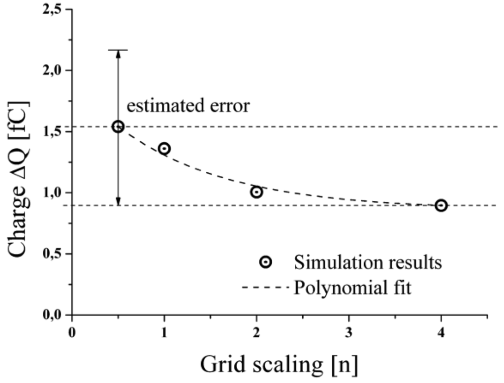 It can be seen that the charge, depicted on the y-axis, declines for higher grid definition (x-axis). The polynomial fit converges to a value of about 1 fC representing the “real” physical condition. Based on this grid study the error of the transient simulations to be presented below was estimated to be about +29% if a grid of scaling 1 is applied. Though, this error is quite considerable, a grid or scaling 1 was applied for all further studies to hold the computational time within a reasonable time frame. Obviously, the presented grid study exhibits a convergence from larger to smaller values. However, in the general case it cannot be assumed that this is the case for any initial or boundary condition. Therefore, the estimated error should be assumed to be symmetric about the simulated values. Nevertheless, it turns out in all considered cases, like presented below, that the simulated results tend to overestimate the experimental or analytical findings by about approximately this error estimate of 29%.