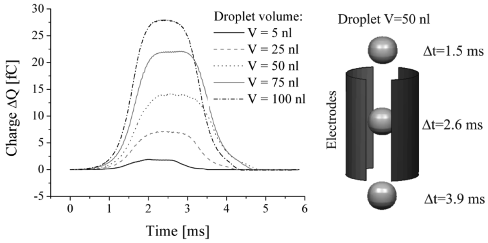 To investigate the feasibility to solve the described multi-disciplinary problem the presented computational model was used in a simplified setup. Simulations were performed with defined spherical droplets of various volumes in the range from 5 to 100 nL neglecting the described droplet generation model. The droplets were defined as initial conditions in the model passing the capacitor with a constant shape at a defined velocity of v = 1 m/s. The charge characteristic on the measurement electrode was extracted as a function of time and is given in Figure 6 for five individual droplet sizes. The almost symmetric signals reflect the flight of the spherical droplets through the capacitor. The maximum change in charge is reached when the droplet approaches the horizontal centreline of the capacitor, like shown in Figure 6 (Δt = 2.6 ms at V = 50 nL). Like expected, the maximum charge alternation increases with higher droplet volumes, thus the feasibility to apply the sensor for volume measurements is confirmed. However, these simulations do not reflect the known signal characteristics, in particular the non-symmetric signal shape including the negative dip gained from experiments as displayed in Figure 1. Therefore, the full model of the dispensing process has to be considered to include the droplet tear off process as well as the effect of capacitive coupling.