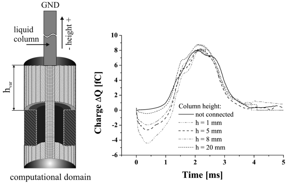 To confirm the influence of the capacitive coupling effect in a quantitative manner the height of the liquid column was varied, to increase the displacement of the ground potential at the end of the column, see Figure 8. This leads to a decrease of the liquid columns capacitance, which can be expected to increase the negative signal dip's amplitude. From the results given in Figure 8 can be taken that an increased height entails a decrease of the negative signal dip at a mostly constant maximum signal peak value. Considering an electrically disconnected boundary, omitting the ground potential at the end of the column, results in the elimination of the negative dip. A further effect caused by the changed columns height is the increase of the fluidic impedance leading to the generation of slightly different droplets. This might be the reason for the deviation in the maximum signal peaks. The minimum value of the negative signal dip is attained after 0.4 ms for all simulations, which reflects the tear-off of the droplet from the liquid column. These results lead to the conclusion that the described capacitive network presented in Section 2 reflects the electrical conditions of the presented system. A qualitative comparison to the experimentally gained signals, considering the ratio of negative peak value to positive peak value, led to the conclusion that a liquid column of h = 20 mm represents the experimental conditions best, which was applied for all further simulations.