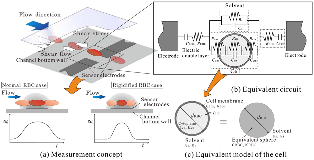 A microsensor consisting of a microchannel and micro-membrane-type electrodes was proposed, and used for measuring the deformability of a single RBC subjected to high shear flow when passing between the electrodes by analyzing the resistance distribution. The fundamental characteristics and optimal design of this apparatus were assessed by performing a numerical simulation. The performance of the sensor was then experimentally evaluated by comparing the simulation results with the results of visualization measurement carried out simultaneously with the resistance measurement. The main results were as follows: