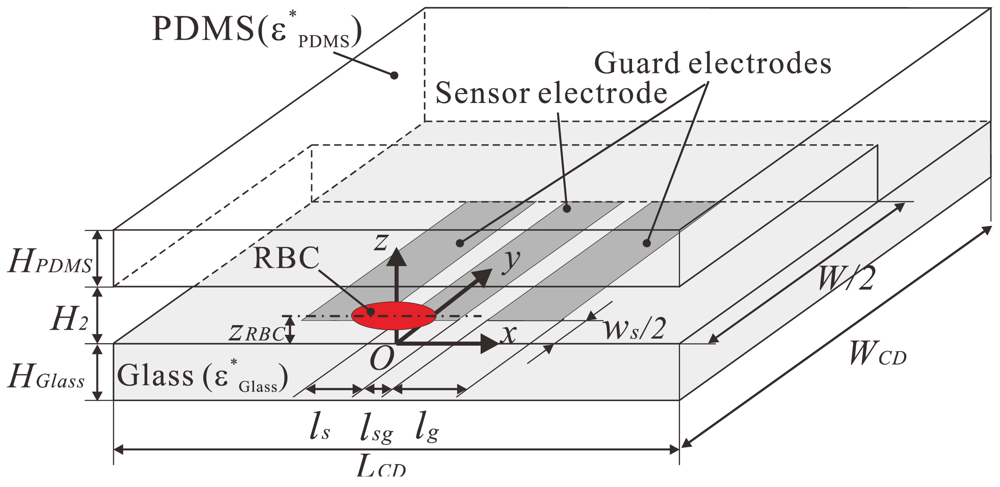 The computational domain is shown in Figure 2. Since the sensor electrodes have a symmetric pattern with respect to the centerline of the channel, a symmetric configuration was applied to the x-z plane in the middle of the electrodes. The material of the bottom wall was glass with a thickness of HGlass. The upper and side walls were made of PDMS, with properties of εGlass = 3.4, κGlass = 1.0 × 10−12 S/m, εPDMS = 2.5, and κPDMS = 1.0 × 10−12 S/m, respectively. The distance between the RBC center and the bottom wall zRBC, the channel height H2, the distance between the sensor and ground electrodes ws, and the sensor width ls, were varied in the computation and will be discussed independently. Other variables were kept constant during the computation and are summarized in Table 1.
