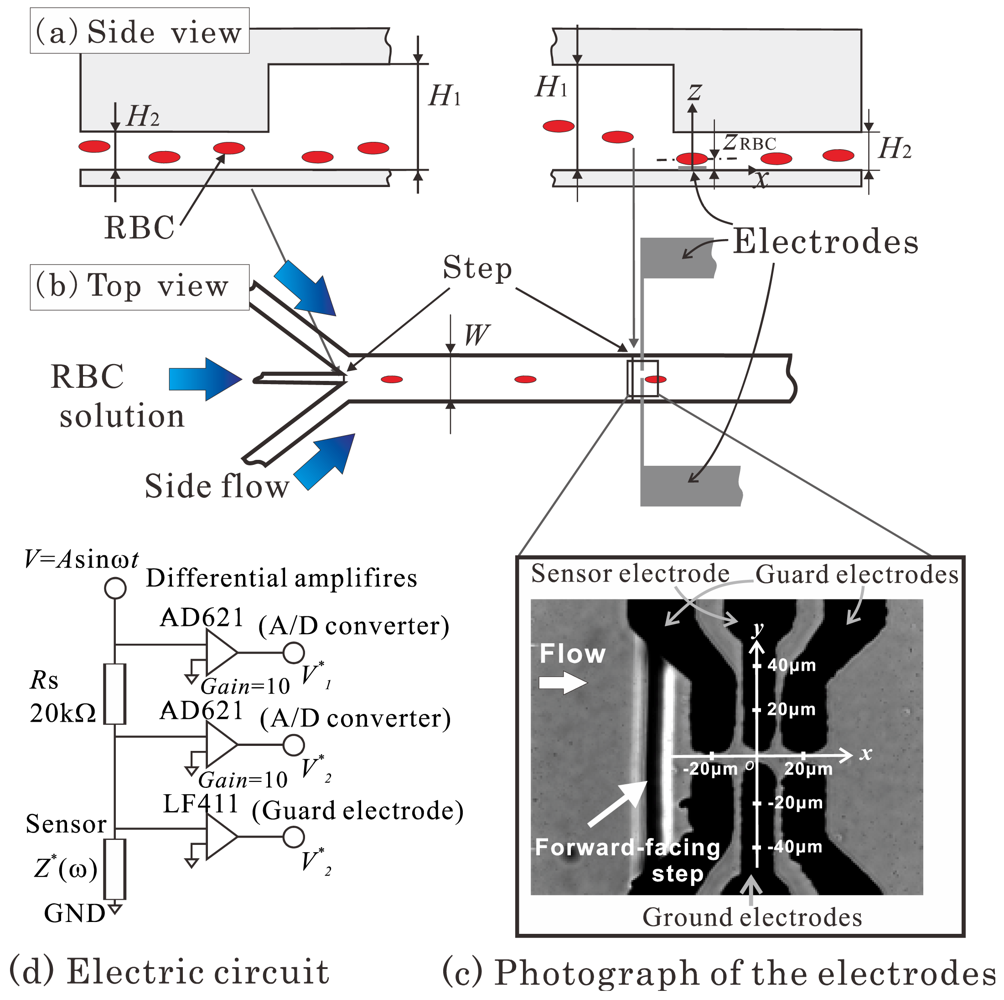 When a RBC is placed in a channel shear flow, the cell receives a lift force that is attributed to the so-called Fåhraeus effect [22]. This lift force moves the RBC away from the channel wall on which the sensor electrodes are embedded, which apparently leads to a decrease in both the measuring resistance and the accuracy of the sensor. To tackle this problem, a backward-facing step was placed at the point where the central inlet and the main channel come together, and a forward-facing step was placed immediately upstream of the electrodes, as shown in Figure 3(a). The RBC supplied from the central inlet would thus remain in a lower position in the main channel, and the downwash flow at the forward-facing step would carry the RBC downward, closer to the bottom wall of the channel. The combined effects of these structures enabled us to control the RBC height position, zRBC, so that the RBC would be close to the electrodes (zRBC ≅ 2 μm) when it passed between them.