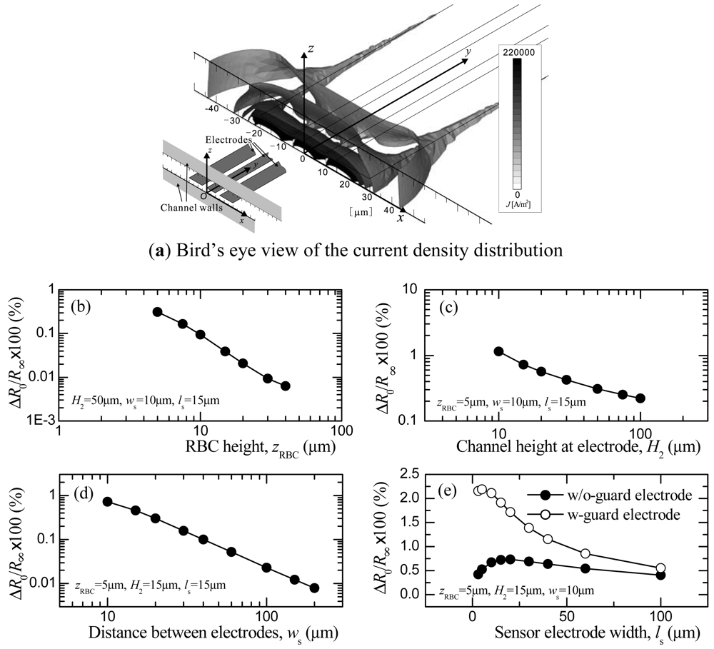 Figure 4(b–e) shows how zRBC, H2, ws, and ls influence the ΔR0/R∞ distribution. First, the relationship between zRBC and ΔR0/R∞ is shown in Figure 4(b). As zRBC decreases, ΔR0/R∞ increases. When considering a current density distribution between two-point electrical charges as an extreme condition, the current density will attenuate by a square function in relation to the distance from the two-point charges. We expected to observe a similar distribution in the electrodes used in this study, as shown in Figure 4(a). That is, a high current density would be produced between the spanwise edges of the sensor and the ground electrodes, and the current density would largely decrease with distance from the electrodes in the streamwise direction and, in particular, in the height direction. A smaller zRBC will increase ΔR0/R∞ and is preferable, considering the sensitivity of the sensor. However, since a RBC has a certain diameter (for example, the diameter of a RBC in the simulation is a maximum of dRBC = 6.7 μm) there is a limitation in positioning a RBC close to the channel bottom wall. For this reason, zRBC is set at zRBC = 5 μm for our discussion of the remaining variables.