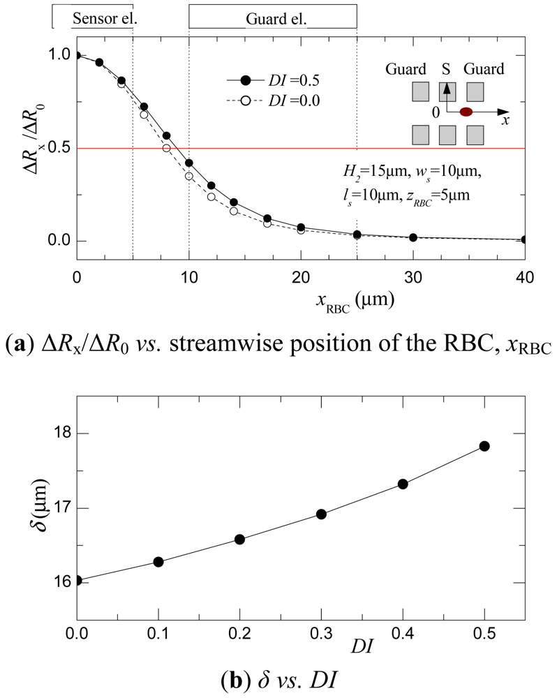 Next, to evaluate the relationship between the deformation index DI and the time-series distribution of the resistance, the electric field was calculated by varying the streamwise position of the RBC, xRBC. The optimized parameters obtained in the previous discussion are used in this case for the channel and sensor geometry. Since the resistance distribution will be symmetric to the xRBC = 0, calculation was carried out for the conditions of xRBC ≥ 0. RBCs with different shapes were calculated by varying DI in the range of 0 < DI < 0.5.