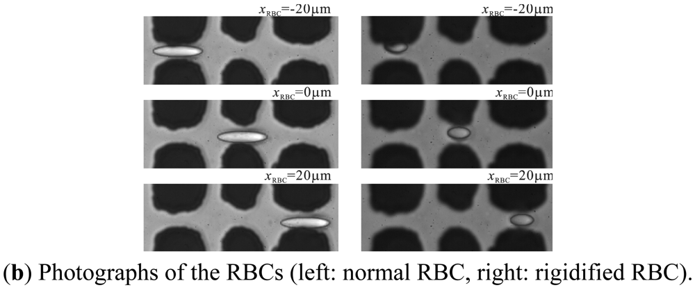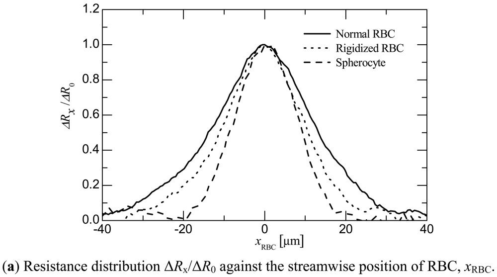Figure 6(a) shows the distribution of the resistance ratio ΔRx/ΔR0 at the moment when the RBC passed between the electrodes. The abscissa xRBC is the streamwise position of the RBC. xRBC was obtained by multiplying the time recorded by the electrical measurement by the streamwise velocity of the RBC as measured by the high-speed camera. ΔRx, ΔR0, and ΔR∞ are defined in the same way as in Section 4.1. The results that represent the distributions of the normal RBC, rigidified RBC, and spherocytes are shown in the figure. In addition to this, photographs of a normal RBC and rigidified one passing between the electrodes are shown in Figure 6(b). This result corresponds exactly with that of a RBC shown in the ΔRx/ΔR0 graph. One can see in the photographs that the RBC is stretched in a streamwise direction by the shear flow and maintains its ellipsoidal shape while passing between the electrodes.