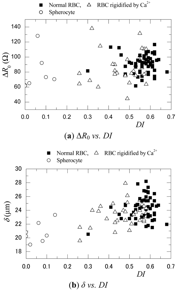 Figure 7 shows the relationship of the maximum resistance difference ΔR0 and the half bandwidth of the ΔRx/ΔR0 distribution, δ, versus DI. These values were obtained from the electrical and visualization measurements. It should be noted that a linear correction was made for the ΔR0 and δ in consideration of the spanwise position of the RBC when it passed between the electrodes. That is, as was also observed in the photographs shown in Figure 6, the spanwise position of the RBC varied in the range of −2.5 ≤ yRBC ≤ 2.5. Although the electrodes and the RBC had a symmetric shape, ΔR0 and δ increased and decreased slightly depending on the spanwise position of the RBC. It is believed that the electrodes were not absolutely symmetric due to their platinum black plating, so that an asymmetric electric field was generated between them. To account for this effect, the linear components in each distribution were subtracted from each value. The results shown in Figure 7 reflect these adjustments that were made.