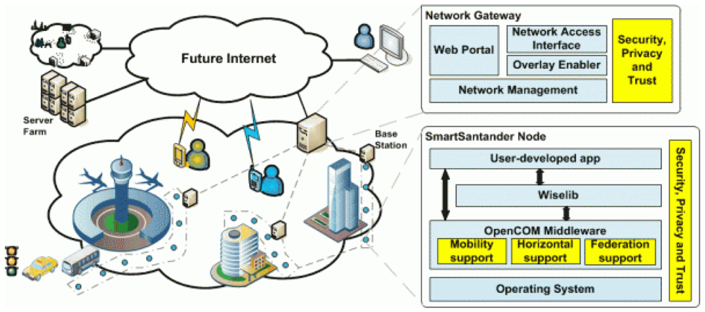 A Smart City can be defined as a city that “uses information and communications technologies to make the critical infrastructure components and services of a city more aware, interactive and efficient” [11]. There is an important and bidirectional relationship between the Internet of Things, Services and People—that is, the future Internet—and the applications for Smart Cities and Ambient Intelligence. All of them need to provide support for heterogeneity, mobility, scalability, security, privacy and trust. Because of these similarities in functionality, they face the same challenges. Amongst other, some of these challenges are: (i) the need to manage heterogeneity in a large number of dispersed sensors and servers; (ii) the huge amount of heterogeneous information to be processed; (iii) the need to have this information available everywhere and always and (iv) and the need to use a common communication network.