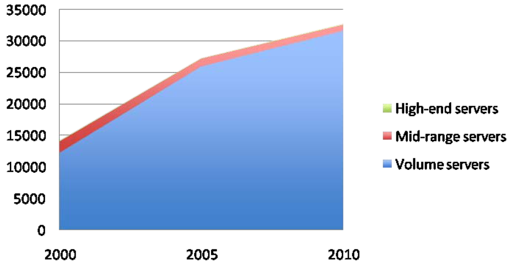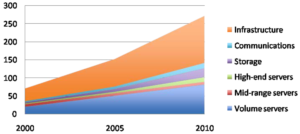 In spite of all these measures, the energy consumption of data centers keeps growing, mainly because of the dramatic increase of supercomputing facilities. Figure 2 shows the number of world servers installed from 2000 to 2010. As it can be seen, the increase is currently reaching 5.75 million new servers per year. This translates into huge amounts of power consumption, mainly devoted to the infrastructure of the data centers and the volume servers (see Figure 3. The total energy usage by data centers is expected to exceed 400 GWh/year on 2015. Bearing this data in mind, it is clear that current effort is not enough, and that further research should be made to reduce power consumption of supercomputing facilities.
