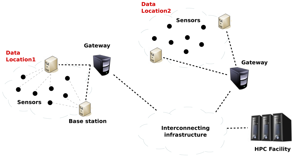 First, in order to develop our solution, we will assume that the aforementioned Smart City architecture is representative. Taking its main elements as a reference, we can state that the services will be deployed over a network with a topology like the one depicted in Figure 4, which is comprised of the following components: (i) sensor nodes; (ii) base stations; (iii) gateways and (iv) HPC servers, organized as follows.