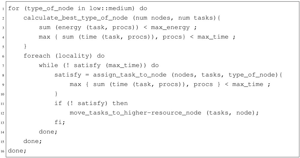 We choose the maximum time as the maximum for a similar scheduling in the HPC infrastructure—that is, the case in which all tasks are allocated in high-resource nodes. That time is reduced by using the SMT solver to place low and medium demand tasks in low and medium resource nodes. It must be noted that locality is managed in such a way that, if the algorithm is unable to allocate a task of, e.g., locality 1 into either the low or the medium-resource nodes, it will allocate the task into the HPC facility, not into an element belonging to locality 2. This way, the algorithm minimizes the communication energy between nodes as well. The aforementioned algorithm will have to be executed each time a new job set arrives, in order to allocate the workload.