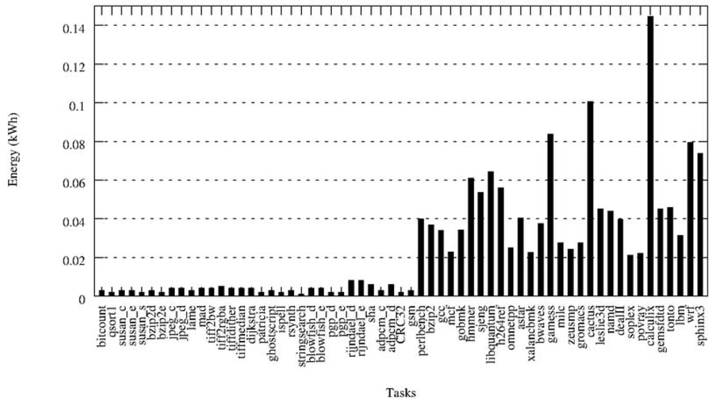 Figure 7. Energy profiling of the tasks in the Intel processor.Task classification of the first and the subsequent job-sets: using all the characteristics obtained during the profiling step, a naive k-means algorithm splits the different tasks into three different classes, according to their computational demands. A projection of the resulting clustering on the energy and time axis is shown in Figure 8. As expected, the low-energy tasks (which also have low CPU-demand) are assigned to low-demand classes and the CPU-intensive tasks are divided into mid-demand and high-demand classes. According to this clustering and because all the tasks of the job set are labelled, each task will be automatically assigned to one of the classes. As in this paper we are trying to assign low-demand tasks to low-resource nodes, mid-demand tasks to midresource nodes and high-demand tasks to the HPC facility by means of the allocation algorithm, a good clustering will be one that splits tasks such that their execution time in each processor is coherent; that is, the allocated task properly adapts to the resources it has been assigned to. In order to validate our clustering, we execute the tasks in the processors where they are classified and we measure their execution time. Results are shown in Figure 9. As it can be seen, tasks are executed within proper time limits, and there are not low-resource tasks that need too much execution time. Because the Base Stations consume less power than the Gateways, and the Gateways less than the HPC servers, we can also conclude that the energy graphic will have the same shape as the time graphic of Figure 9.