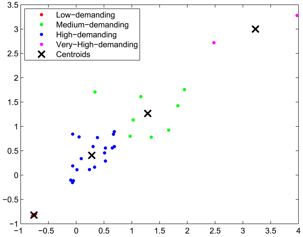 Profiling of the tasks of the first job set in the IntelXeon machine: as explained in Section 3.2, we use the first job set of the workload to profile the tasks in the HPC facility. The profiling step gathers information about the following features for each task: average CPU usage, memory used, time needed to complete execution and energy. On Figure 7 the results for the energy profiling of the tasks are shown. The Y-axis represents the energy variation (in kWh) when allocating a certain task in a certain processor—that is, the values of etp for p being an Intel processor. This Figure lets us deduce intuitively the three different types of tasks: the low-demand tasks consume very little energy, the medium-demand tasks consume a little more, while there are other tasks that comparatively consume a lot of energy. However, making this assumption only with the energy results and without paying attention to other characteristics such as the CPU-usage would be a naive approximation. Therefore, in the next step a clustering that takes into account all the features is performed.