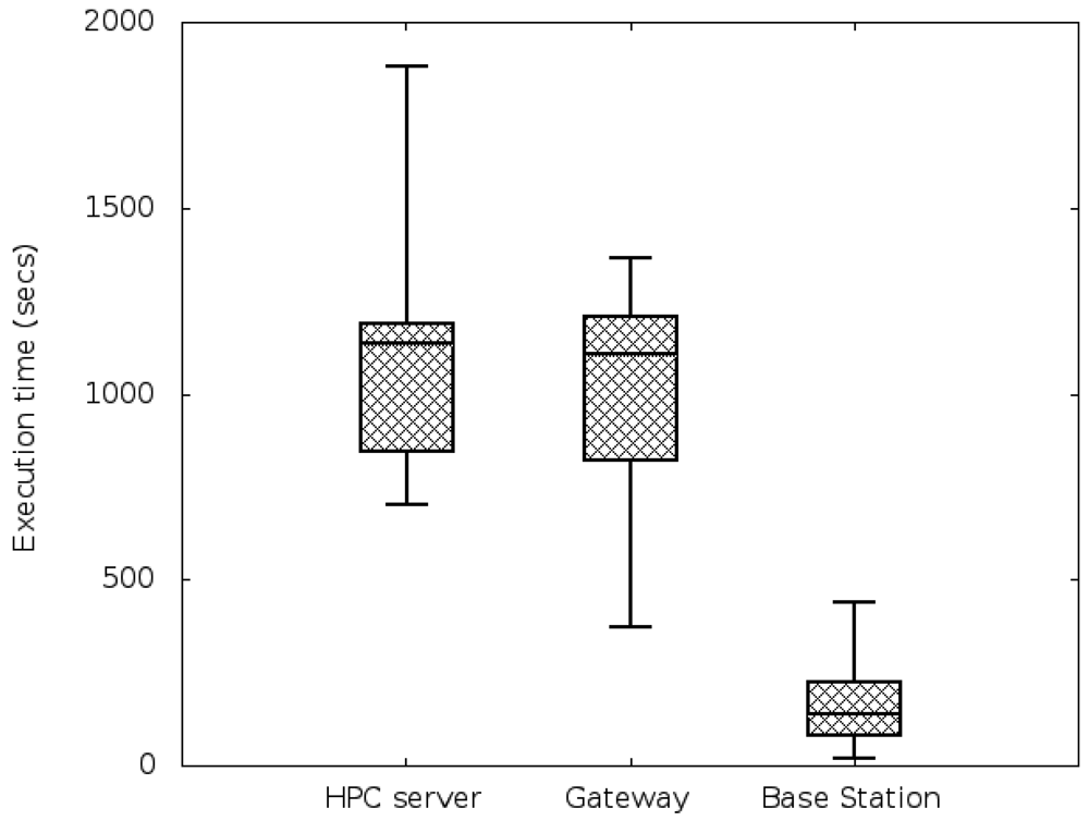 As for the communication infrastructure, even though we have neither calculated nor taken into account the savings, it is clear that tackling with locality allows us to reduce dataset traffic through the infrastructure. If a particular task that needs a particular dataset is executed in a BS or a GW near the source, data does not have to travel to the HPC facility, and communication costs are reduced.