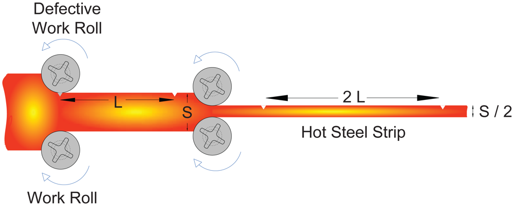As discussed in Section 3.2.1, the theoretical period length of the rolls involved in the production process must be known before starting the detection. Thus, the time required to perform the detection can be reduced by searching only periodical defects with such periodicities, instead of iterating through a range of possible values as made by Traxler et al. [25]. In our practical application, the theoretical period length does not correspond to the perimeter of the rolls since the length of the material varies, but it can be calculated easily. The forces applied during rolling produce friction on the strip, which is lower in the transversal direction than in the forward direction of the strip, cause the stretching of the strip in a forward direction and not sideways. Figure 10 shows an example in which a defective roll generates a periodical defect whose period length is initially L (the perimeter of that roll) when the thickness of the strip is S. Passing through the next stand, the thickness of the strip is reduced to S/2. Since the volume of the steel remains constant, the length of the steel increases proportionally, causing the separation between two consecutive individual defects within the periodical defect to increase to 2L. Considering the separation between each pair of work rolls of the same stand and their radii, the theoretical period of each cylinder can be calculated by Equation (19) [31].