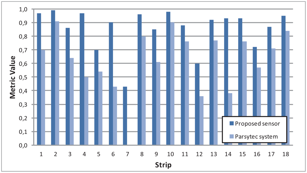 The obtained results after using the proposed sensor on the set of test strips is shown in Figure 11 with the results provided by the Parsytec system for that same set. The numerical data are also listed in Table 2. These results show a clear improvement, since the output provided by the proposed sensor has obtained a better rating than the Parsytec system for all strips. Table 3 shows the average metric values provided by each system.