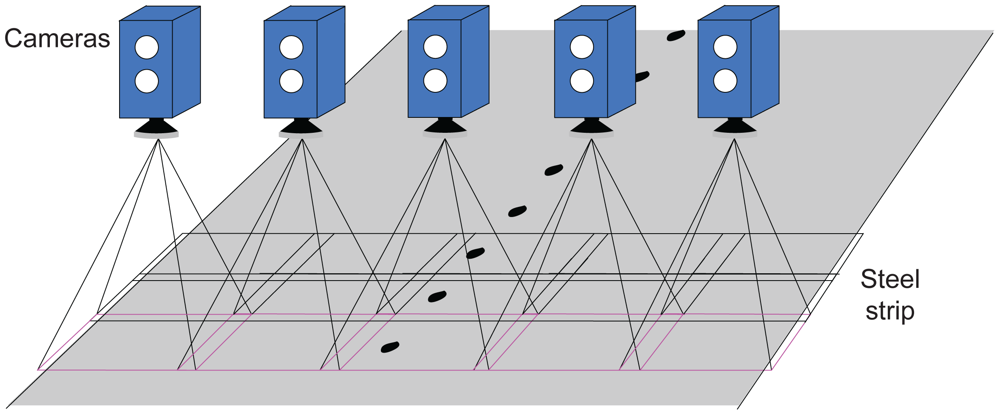 There are several studies about the development of vision-based sensor systems for industrial use, such as inspection tasks [2] or defect detection tasks in many different fields, like satin glass [3], welds [4], bearings [5] or ship hulls [6]. Depending on each case, the design of the vision system (cameras, lenses, lighting, etc.) is different. It is critical to build the most suitable vision system in each case in order to obtain satisfactory results [7]. In the particular case studied here, the sensing tasks are carried out using several cameras, which take images of both surfaces of the material to be inspected. The areas inspected by the cameras are overlapped in order to ensure complete coverage, as shown in Figure 2. These images are used by a software system to perform other typical tasks of these systems, namely fault detection, characterization of defects, feature extraction and classification [8]. Using an inspection system that performs these tasks, the technicians responsible for quality control can obtain information about the position and class (or type) of each defect present in the produced material. Some of these systems are able to determine whether a surface defect is a roll mark or not, based on its features. Thus, a technician can find out that at least one roll is defective. In production lines in which only one roll can generate defects, this information may be sufficient. However, in more complicated cases, where several rolls can be the source of such defects, more information about the periodical defects generated is required to determine which roll must be replaced.