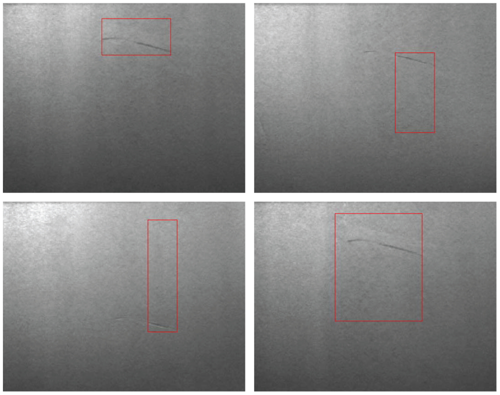 As mentioned above, the uncertainty introduced by the inspection system must be taken into account. Figure 3 shows four different individual defects generated by a defective roll during the production of a steel strip. They all have the same shape, but the dimensions estimated for each of them by the inspection system are very different. Consequently, the position assigned to each is not correct, since it is calculated as the central point of the square surrounding the defect. Although these cases are extreme, the inspection system always introduces an uncertainty in the characteristics of each individual defect (this error may be higher or lower depending on the web material inspected and the inspection system used). Since the type assigned to each surface defect depends on its characteristics, if they are not precise the assigned type may also be incorrect.
