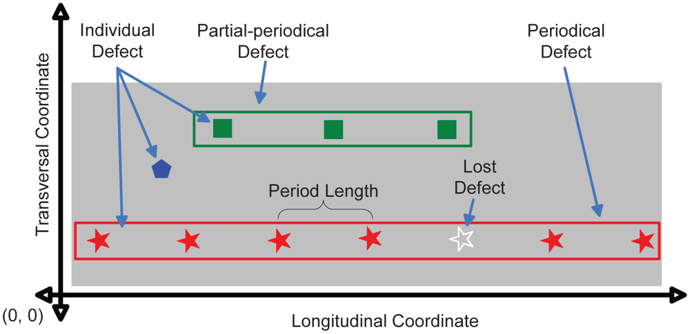 Since the aim of this study is the detection of periodical defects, an abstraction to represent them is also necessary. As periodical defects are composed by a set of individual defects generated by a defective roll periodically, they can be considered as a periodical pattern. This pattern can be defined by the following features.