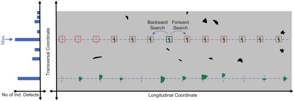 The search space is explored in two steps: the forward search and the backward search. Both start from the position of the initial defect, located in (iid.tr, iid.lo). When performing the forward search, the algorithm starts checking whether an individual defect is located in (iid.tr ± t_tol, iid.lo ± pd.p ± pd.p · p_ratio). If there is an individual defect within that area (candidate individual defect, or cid), its characteristics should be checked. That individual defect is only included in the periodical defect if it meets the following conditions: