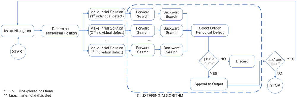 Figure 6 shows the main steps of the clustering method. Accordingly, once the initial solution has been created and the clustering algorithm has been executed, periodical defects placed at other transversal positions are sought. To do this, the histogram is calculated again, without taking into account the individual defects included in a periodical defect previously detected. An initial solution is created for that transversal position and the clustering method is applied again. These steps are repeated until all transversal positions have been checked or the time available for performing the detection is exhausted.