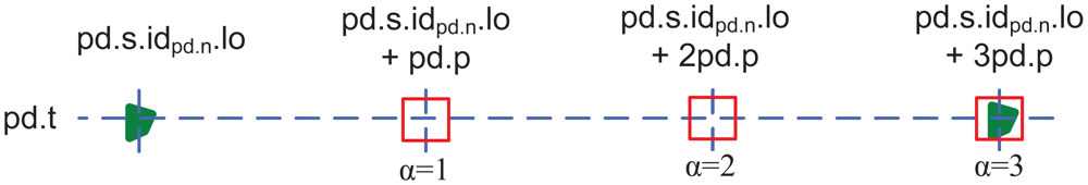 Note that the longitudinal positions of the points above are calculated using pd.p instead of the theoretical period length since it may have been estimated with low precision. However, pd.p contains the actual average distance between individual defects. Thus, the error in the case that the theoretical period length has not been calculated with sufficient accuracy is minimized. In order to further minimize the error in these calculations, both the transversal and the longitudinal position of these points should not be determined as a function of iid.tr and iid.lo but by the average transversal position (pd.t) and the longitudinal position of the last defect inserted in the set (pd.s.idpd.n). In this way the area to be checked until the end of the web material is reached is defined by Equation (15).