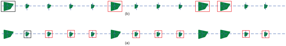 A very important aspect that must be taken into account is that the individual defect selected to form the initial solution greatly affects the search, since the values of their characteristics iid.tr, iid.ar, iid.wi y iid.le are assigned to features pd.t, pd.a, pd.w y pd.l of its periodical defect respectively at the beginning of the search. Thus, the clustering algorithm includes in the periodical defect only those individual defects whose characteristics are similar to those of the individual defect included in the initial solution. Therefore, if this individual defect was detected by the vision system incorrectly (e.g., assigning a value to its dimensions and area much larger than they should be) the clustering algorithm will not work properly, since it will include only individual defects similar to it (whose dimensions and area are also incorrect), as shown in Figure 8. In this figure, the individual defect chosen to form the initial solution is surrounded by a black square, and individual defects included in the periodical defect by the clustering algorithm are surrounded by red squares. The clustering is better in the cases where the individual defect included in the initial solution is more like the majority of individual defects that form the periodical defect. Since the individual defect most appropriate to form the initial solution can not be determined before running the algorithm, it must receive as many initial solutions as individual defects are located at the transversal position determined by the histogram (see Figure 6). For each of them, both forward and backward searches are applied. The largest periodical defect (i.e., the one whose feature n is greater) is the one chosen to be part of the output, but only if its feature n is greater than the size threshold.