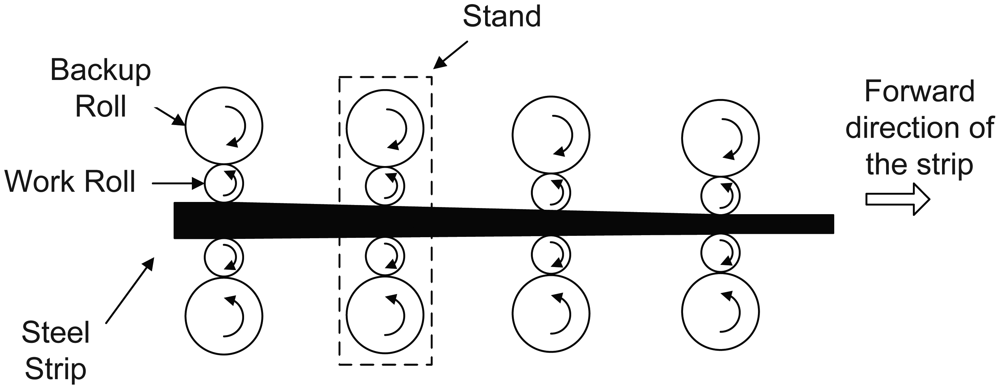 In this application, the generation of periodical defects occurs in the finishing mill (Figure 9), where hot steel is stretched and flattened by several rolls, exerting great pressure on steel until it reaches the form of a strip of great length. During the rolling process, the strip has to pass through seven stands. Each one consists of four rolls: two backup rolls and two work rolls. The backup rolls transmit force to the work rolls, which are those in direct contact with the steel. For this reason, the work rolls are those that can generate periodical defects on the surface of the strips. The surface of the work rolls must be completely smooth to obtain a perfect rolling. Besides the typical problems on rolls (cracks or attached objects), in this particular case they become worn very quickly [30], which makes the inspection even more important so as to replace the malfunctioning rolls as early as possible.