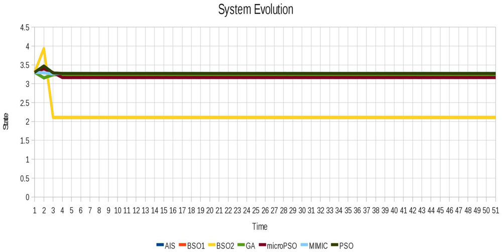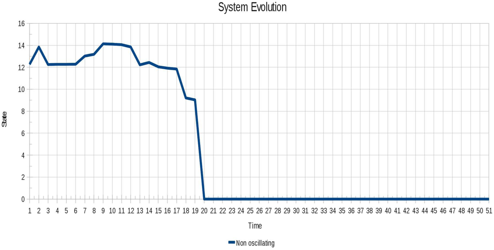 In order to see the cyclic instability and how it is removed, for each test instance we show the evolution of the system before and after locking. In Figure 6 the oscillatory behavior of instance 1 (Blinker) is shown and in Figure 7 the instabilities are successfully removed from the instance 1 (Blinker). In Figure 7 different evolutions can be seen, because for this scenario different sets of locked agents can achieve system stability.