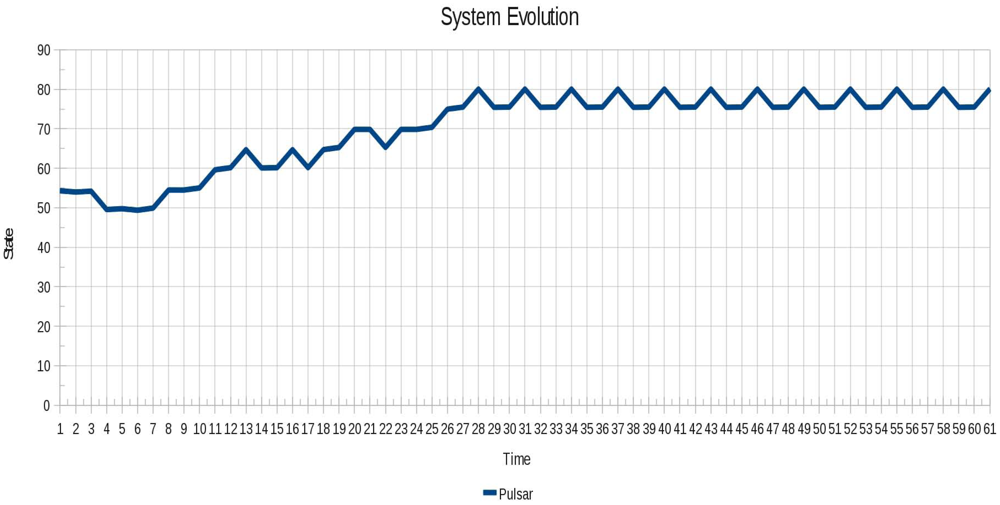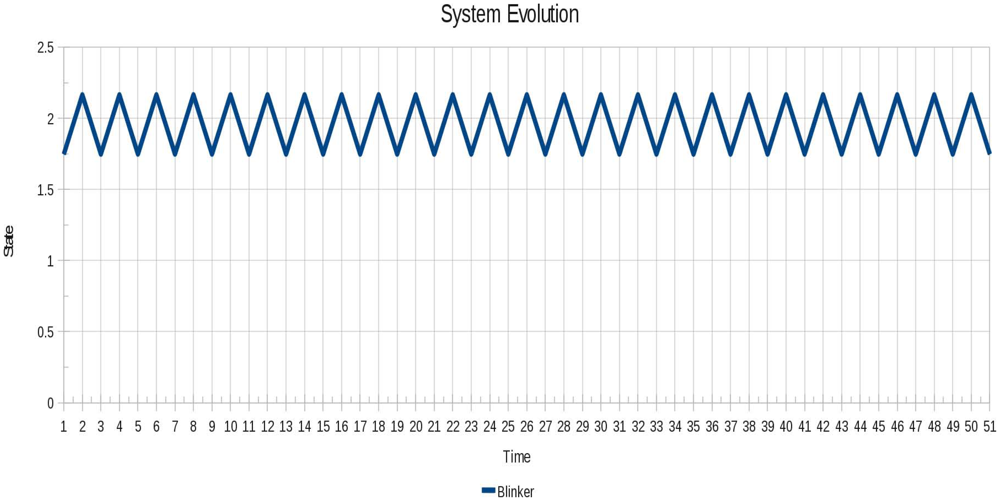 Table 6 shows the level of oscillation obtained for each of the instances taken from the Game of Life. The value obtained assumed that the system remain unchanged during its evolution, i.e., from the initial conditions, the system is allowed to evolve according to the rules of the scenario itself without interference for the entire time of evaluation.