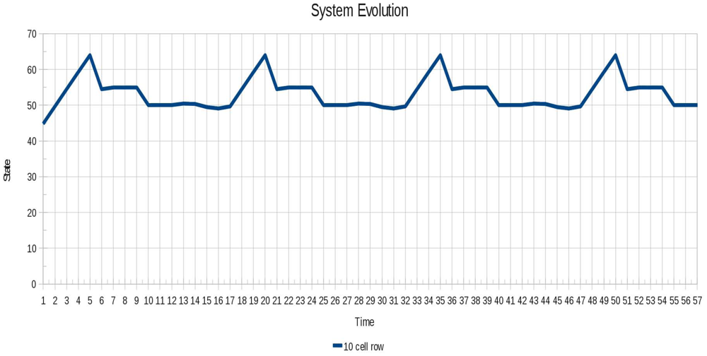 The oscillatory behavior of the instance 5 (10 cell row) is shown in Figure 14. It is seen that the oscillation began quickly in contrast to the Instance 4 (Pulsar), whose oscillation is seen until after a certain period of time.