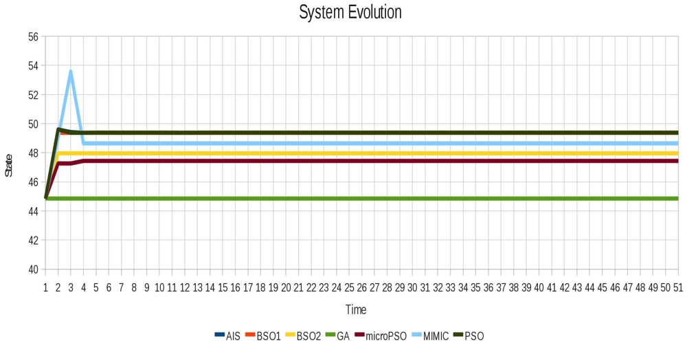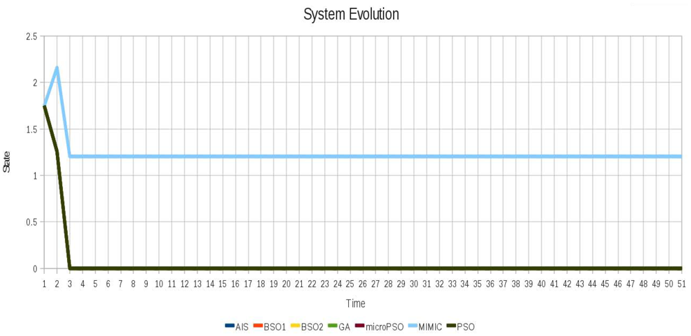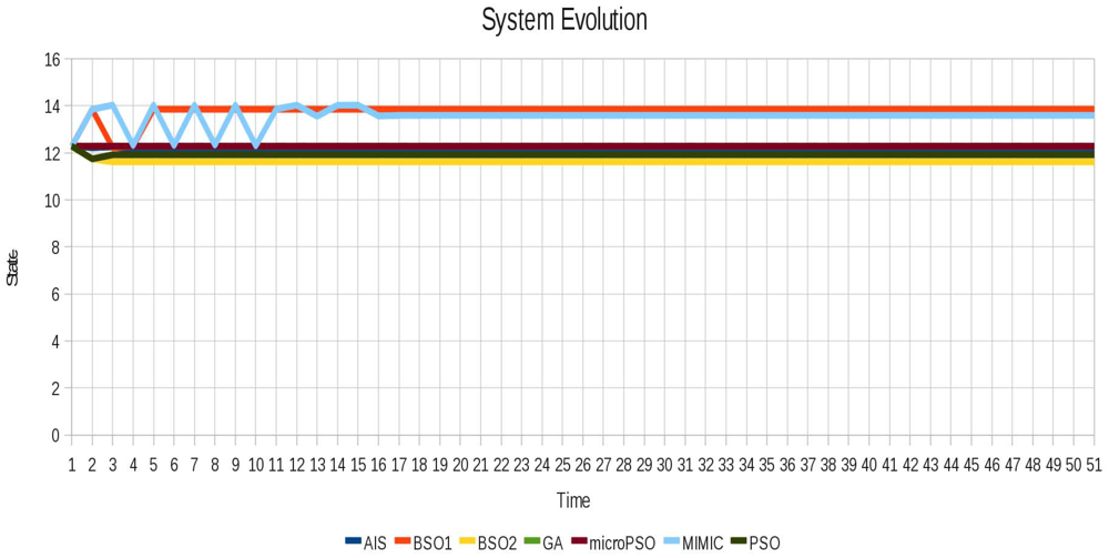 For the instance 5 (10 cell row), again the number of agents represented is therefore significant. The performance results are similar to those described for instance 4 (Toad) and the best results obtained by the techniques vary with respect to each other. The behavior without oscillation is shown in Figure 15. The difference between the behavior of each algorithm responds to the different sets of locked agents by each of the techniques.