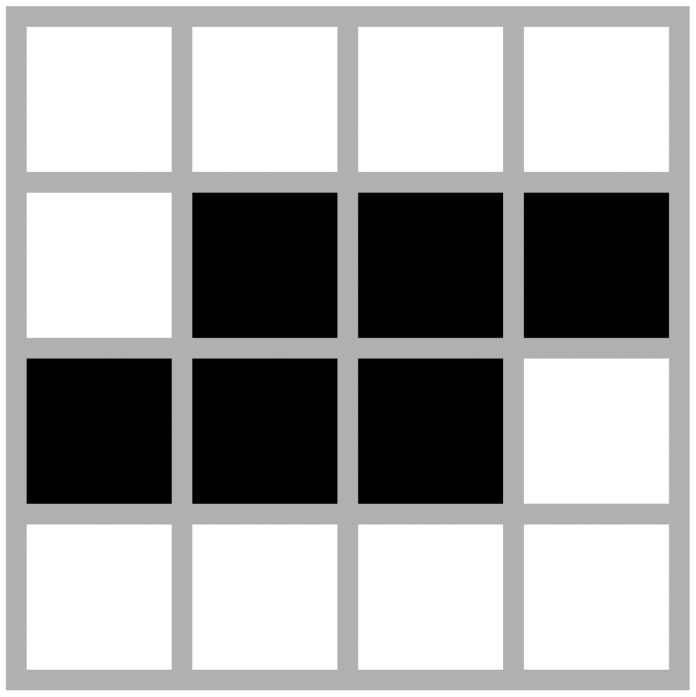 The configuration presented in Figure 3 is known as Toad. This oscillator is a bit more complex than the Blinker in terms of the number of agents involved or affected by the oscillation. However it has also a period of 2 like Blinker. This oscillator fits into a grid of 4 × 4, thereby containing 16 agents within the system.