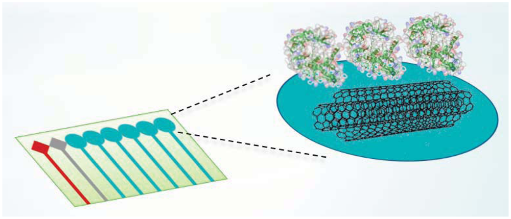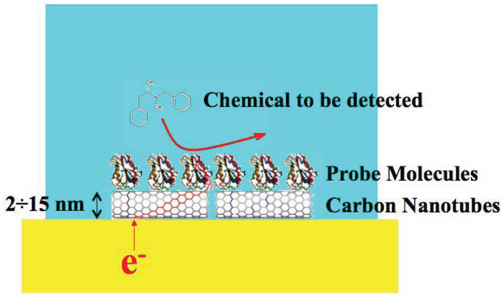 Carbon nanotubes (CNTs) have been recognized as very promising nanomaterials for enhancing electron transfer [32] in biosensing (Figure 1) thanks to their electrical and electrochemical properties which make them suitable to be integrated into biological sensors. For these applications, carbon nanotubes present several advantages: small size with larger surface area, high conductivity, high chemical stability and sensitivity [33], high electrocatalytic effect and a fast electron-transfer rate [34].